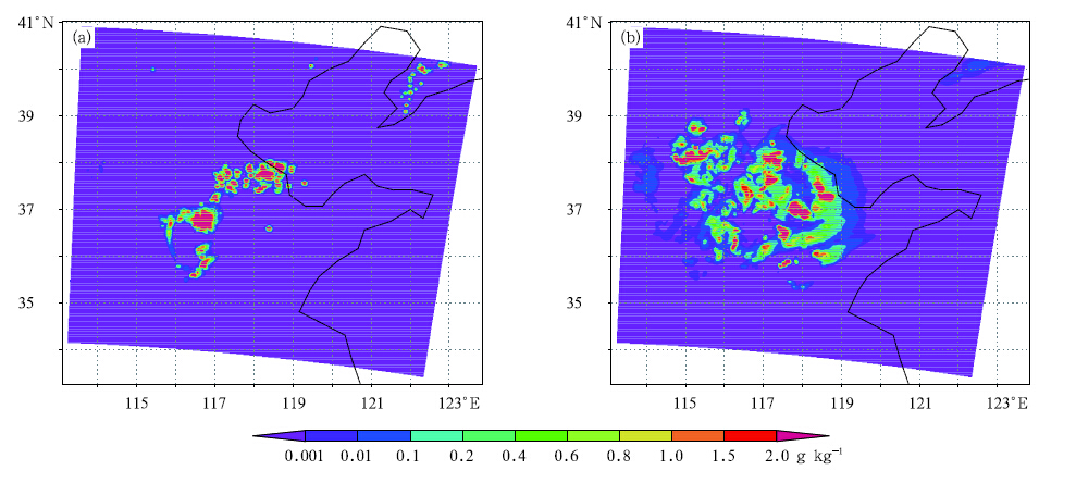 In most cases, there are not only liquid phase hy-drometeors(e. g., cloud water and rain water)but alsoice phase hydrometeors(e. g., ice crystal, snow, grau-pel, and hail)in mesoscale and microscale convectivesystems, such as squall line, tornado, etc., with deepcloud height and cold cloud top temperature below0 during their vigorous development period. Theice phase hydrometeors and their microphysical pro-cesses play an important role in the occurrence and development of convective systems. Radar reflectivitydata include all information of liquid phase and icephase hydrometeors. If only a simple cloud microphys-ical scheme without ice phase processes is employedin the numerical model, the actual state of hydrome-teors in the atmosphere certainly cannot be correctlyretrieved in the assimilation procedure. Furthermore, it would bring false information into the cloud fields, and have a negative e®ect on forecast performance ofother variables. As discussed in Sections 6. 1. 2 and 6. 2. 1, mixing ratio of the analyzed and simulated hy-drometeors at 500 hPa in the assimilation experimentis similar to that of the observation. At 500 hPa, itis ice phase hydrometeors such as snow and hail thatmake the greatest contribution to the total mixingratio of hydrometeors. The good performance of theWRF model in analyzing and forecasting hydrometeorfields in both their distributions and magnitudes forthe studied squall line case is closely related to theaccurate analysis of ice phase hydrometeors by theassimilation scheme when assimilating radar reflectiv-ity data, as well as to the complicated cloud schemeused in the forecast model which includes ice phasemicrophysical processes.