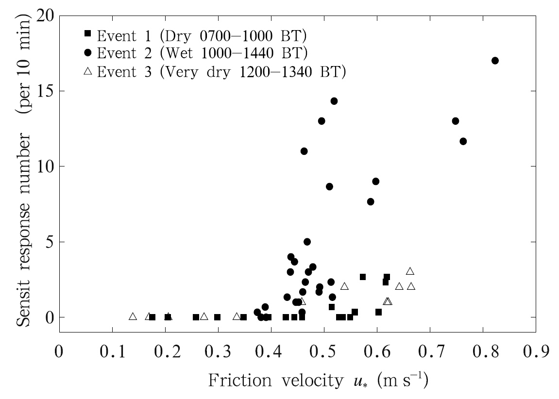 Figure 7 shows the variations of u* and the Sensit response number during the dust-emission periods ofthe three dust events. The strong and sustained saltationactivities were observed in Event 2 under wet conditions.For most of time,when u* had the same value,the observed Sensit response numbers were larger inEvent 2 than those in Events 1 and 3. The possiblereason is that dust particles adhered to s and particlesor aggregated together when the soil was wetted bythe rainfall event,which may provide more potentialsaltating particles than under dry conditions. It hasbeen observed that the increasing soil moisture canmove the peak of surface particle size distribution towardsa larger size(e.g.,Mikami et al., 2005; Ishizuka et al., 2008). Unfortunately,the surface s and particledistribution was not measured for these three events.