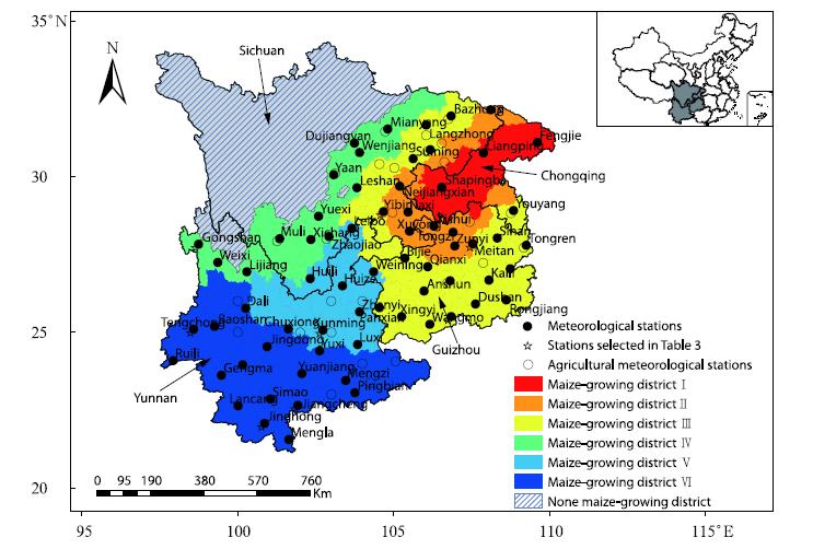 Southwest China(SWC)comprises Yunnan, Guizhou, Sichuan provinces, and Chongqing City. Ithas a total area of 1. 137×106 km2, and is locatedat relatively low latitudes(over approximately 20°-35°N). Known as "the third Golden-Maize-Belt" afterNortheast China and the North China Plain, SWC isone of the major maize production areas of China. Thetotal quantity of maize sown in SWC is about 5 millionha, which accounts for nearly 20% of the national total(Pan and Yang, 2012). Maize production in SWC is akey part of both local and national maize production and plays a vital role in guaranteeing grain securityin China. Nevertheless, maize production in SWC isthreatened by frequent seasonal drought events, despite annual precipitation being su°cient for crop water requirements(Wang Mingtian et al., 2012). Previous studies indicate that SWC has experienced awarming trend over the last five decades, especiallyin the most recent 20-25 years, and has witnessed astatistically significant decrease in autumn precipitation(Qin et al., 2010). Zhang Mingjun et al. (2013)identified this area as one of the most susceptible areasto climate change in China. In the past decade, severe and frequent seasonal droughts have struck SWC, seriously damaging crop production(Zhang Mingjun et al., 2013; Zhang W. et al., 2013).