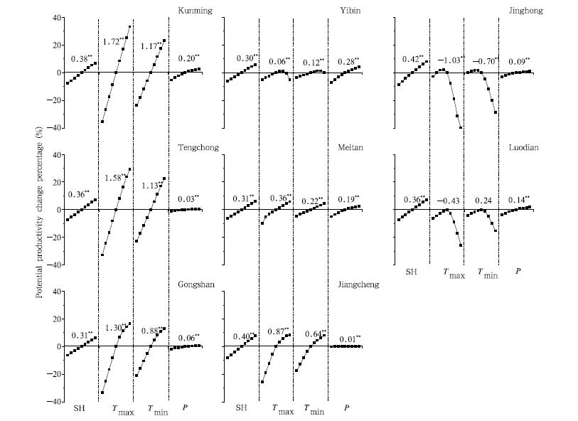 Sensitivity analysis is important in underst and ingthe relative importance of climate variables to the variation of potential productivity. A simple but practicalsensitivity analysis is performed in this study, i. e., therelative changes of a dependent variable are plottedagainst relative changes of independent variables as acurve(Gong et al., 2006). The sensitivity coefficient, i. e., the slope of the curve, can represent the changein potential productivity caused by any perturbationof the variable concerned. Relative change series(i. e., ±5%, ±10%, ±15%, and ±20%)of sunshine hours, maximum temperature, minimum temperature, and precipitation, respectively, are used to detect the relative change in potential productivity while all othervariables are held constant.