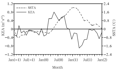 | Fig. 5. Composite evolution of SST A(dashed line; ℃)inthe Niƥno 3. 4 region and kinetic energy anomalies associated with the atmospheric intraseasonal oscillation(KEA;solid line; m2s-2)over the equatorial western Pacific overfive strong El Niƥno events. The axis label 0 indicates theyear of El Niƥno onset. [From Li et al., 2008] |