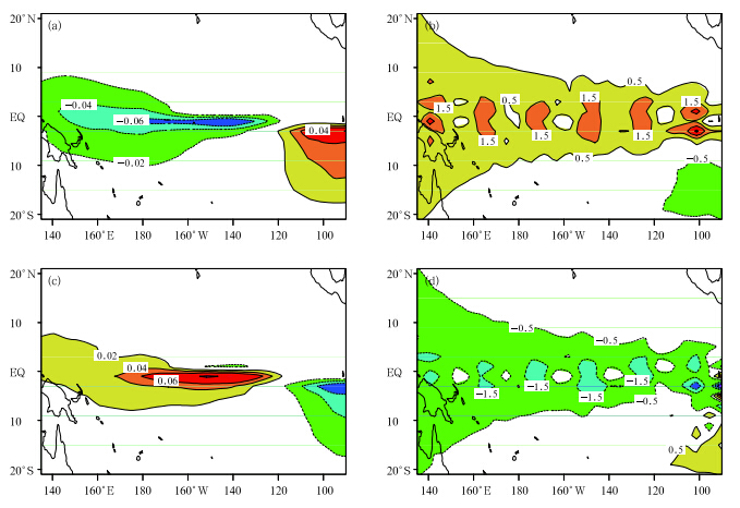 Mu et al.(2007b)used the Zebiak-Cane modelto investigate the initial error and found that theCNOP method represented the initial error that hadthe largest effecTon the ENSO prediction, namely, theOGE, which could yield a significant SPB for El Niñoevents. They also argued that although some otherinitial errors had the same magnitude as the CNOPs, these errors neither caused significant prediction uncertainties nor yielded apparent season-dependent evolution, and therefore failed to induce SPB for El Niñoevents. It is clear that a particular error pattern is necessary for the occurrence of SPB for El Niño events. Yu et al.(2009)further divided the CNOP-type initial error into two types using cluster analysis(Fig. 2). The first type of CNOP error(termed type-1OGE)possessed a thermocline depth anomaly component with a deepening along the equator, and anSST A structure with negative anomalies in the equatorial central to western Pacific and positive anomalies in the equatorial eastern Pacific. The other type(type-2 OGE)possessed a sign almosTopposite to theformer. Although the two OGEs had different patterns, they were both associated with a localized region, so predictions may be sensitive to this.