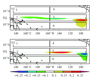 To test the validity of the aforementioned sensitive area, Yu et al.(2012b)divided the tropical Pacificinto six parts with equal numbers of grid points(Fig. 4). Domain 5 covers the equatorial central and easternPacific and has the large amplitude area of both theOPR and OGE for El Niño events. F or each domain, the CNOP-type initial error was computed and themaximum prediction error caused by the initial errorwas checked. It is found that the initial error in Domain 5 evolved more significantly than those in otherdomains. This reflected the fact that the SST initialerrors over the equatorial central and eastern Pacificmay have the biggest effecTon El Niño prediction.