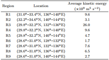 To examine the validity of the sensitive area, Wang et al.(2013)investigated the evolution of initiar and om errors in different areas. Figure 7 shows ninelocal regions with the same size(240 grid points), including the sensitive area R3 and eighTother arbitrarily chosen regions. These regions mainly cover thesouth of Japan and upstream of the Kuroshio extension. F orty r and om error fields were generated for eachregion. The generation process was follows: first, ar and om sequence with a normal distribution of variance σij was generated, wherei and j denote thevariables in the 1.5-layer shallow-water model and thegrid point, respectively . The r and om sequence wasdenoted as N(0; σij), where i has the range 1-3 and j = 1-240. A r and om number selected from N(0; σij)was regarded as the r and om error for the variable i atthe grid point j, creating a r and om error field for eachregion. To compare the evolution of the r and om error and the type-1 OGE, Wang et al.(2013)scaled ther and om error field, xr, so that its total energy equalsthaTof the type-1 OGE. The average kinetic energyof the forecast errors caused by the r and om errors islisted in Table 1 for each region. These results showthat the evolution of the initial errors depends on theirlocations. The forecast error caused by the error in thesensitive area R3 is the largest.