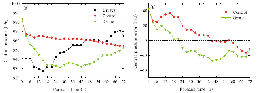 | Fig. 4.(a)Sea level pressure(SLP)of the center of Hurricane Earl from control and ozone experiments of Earl0118 and Unisys(http://weather.unisys.com), and (b)SLP error of control and ozone experiments of Earl0118 during the 72-hhindcast period. |