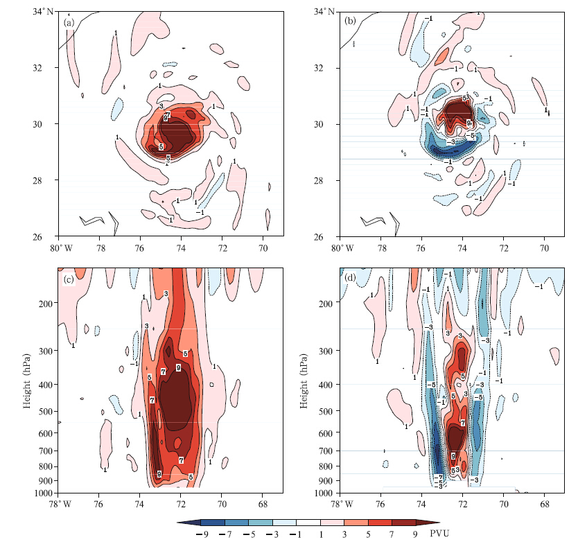 | Fig. 5. Horizontal distributions of(a)PV at 400 hPa from the control experiment and (b)PV increments at 400 hPafrom the ozone experiment. Zonal sections across the hurricane center of(c)PV from the control experiment and (d)PV increments from the ozone experiment. All panels are for Earl0118 at 1800 UTC 1 September 2010. |