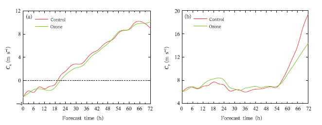 | Fig. 9.(a)Zonal and (b)meridional components of the steering flows from the control and ozone experiments ofEarl0118 during the 72-h hindcast period. |