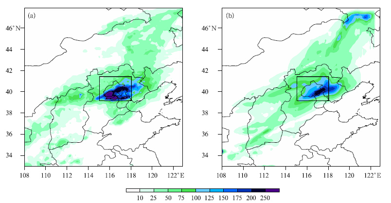 | Fig. 1. Distributions of the amount of(a)observational 24-h cumulative precipitation and (b)that from the CTL-run(mm day-1). The black box denotes the area of Beijing(39.15±{41.4±N, 115.05±{118.05±E). |