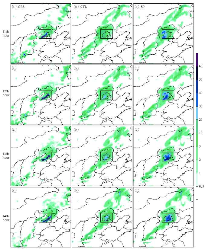 The result of the SP-run-I shows that the SPmethod introduces a slight improvement to the precipitation forecast in the region of Beijing. Specifically, the time when the rain density was largest was captured more precisely, and the maximum precipitationwas closer to that of the observation. The TS scorefor a level of GT 50 mm was improved by 0.01 to 0.02.However, the location of the main precipitation beltstill deviated to the east, and the false alarm rate forGT 100-mm level was higher.
