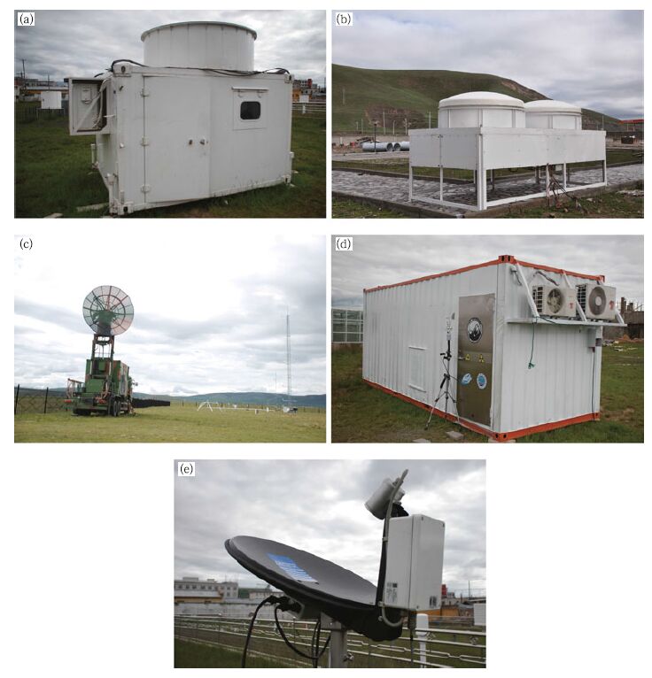 | Fig. 1 The main instruments used in the experiment. (a) Ka-band cloud radar, (b) C-band frequency modulation and persistent wave (FMCW) radar, (c) C-band mobile polarization radar, (d) vapor and cloud observation lidar, and (e) Ku-band micro-rain radar. |