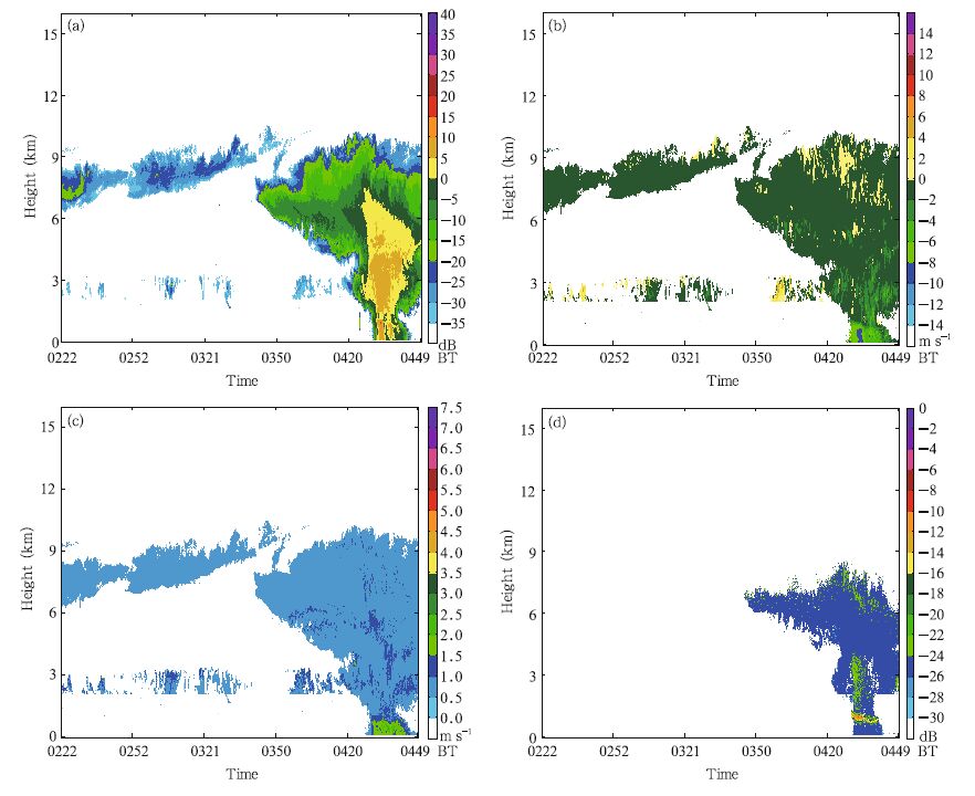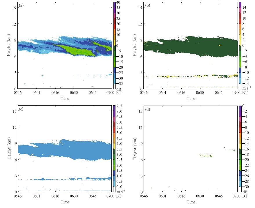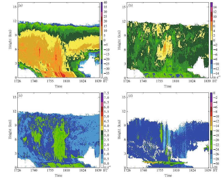 The Ka-b and solid-state transmitter-based millimeter wave vertically pointing cloud radar was used for continuous (uninterrupted) cloud measurements. The reflectivity, radial velocity, velocity spectrum width, and linear depolarization ratio were obtained. Meanwhile, power spectral density data were selected for further analysis. C-b and frequency modulated continuous wave (FMCW) vertically pointing radar system is the first frequency modulated continuous wave radar system used in China for cloud and precipitation observations. It utilizes continuous wave, all-phaseparameter Doppler radar to measure the reflectivity, radial velocity, and velocity spectrum width of cloud and precipitation at various levels with a vertical resolution of 15-30 m. Ka-b and micro-rain radar manufactured in German is used to measure the reflectivity of clouds and weak precipitation and power spectrum, which are used to retrieve the vertical profiles of raindrop size distribution for precipitation below 6 km (0.109-6-mm diameters) and total precipitation, etc. The atmospheric water vapor and clouds lidar used in this study transmitted three wavelengths (1064,532, and 355 nm) to measure and retrieve the mixing ratio of water vapor, cloud depolarization ratio, cloud base height, atmospheric extinction coefficient, and atmospheric backscatter coefficient profile. The maximum detection range of the system is 20 km, the range for water vapor mixing ratio is 0.2-5.0, and 0.2-15.0 km for cloud base and cloud depolarization ratio. These vertically pointing radars and lidars with three different wavelengths constitute the comprehensive observing system for measurements of clouds and precipitation with various intensities and at their different developing stages.