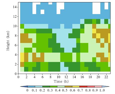 In order to further analyze the cloud distribution at different altitudes, we analyzed the occurrence frequency of cloud at various altitudes. The occurrence frequency of cloud at a specific layer is defined by the ratio of the number of radar beams with significant cloud detection at the altitude to total number of radar beams. Note that the occurrence frequency of cloud defined here is closely related to the minimum reflectivity radar observed. Under the same condition, the occurrence frequency of cloud decreases with height because the minimum reflectivity increases with height. Figure 3 presents the diurnal variation of the occurrence frequency of cloud at 1-h interval and 1- km interval at different vertical levels. It is found that clouds over the TP largely distribute below 10 km, and the occurrence frequency of cloud above 10 km is less than 10%. The vertical distribution of clouds is clearly stratified. Few clouds are found at 5-km height, while large amounts of clouds concentrate at levels of 2-4 and 6-9 km. Clouds rapidly develop at levels above 5 km after the noon, especially during 1800-0400 BT. High frequency of cloud formation is found at levels between 6 and 9 km, where the number is larger than 50%. Above 6-9 km, parts of the clouds are deep cumulus clouds and parts are altostratus and altocumulus clouds that form after the dissipation of deep convection.