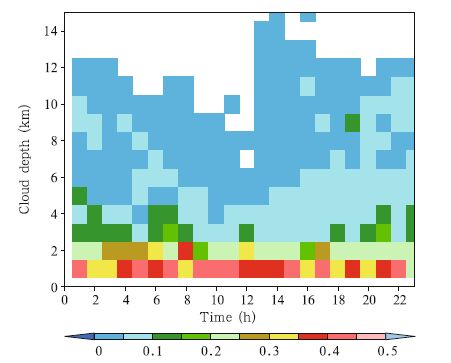 Cloud depth is defined as the difference between the heights of cloud top and base. The cloud depths are made detailed statistical analysis at 1-h and 1-km intervals at vertical direction. Clouds at multiple levels are considered. The diurnal variation of cloud depths distribution is shown in Fig. 4. It is found that the frequency of cloud deep deeper than 5-km clouds is less than 15%, while shallow clouds with a cloud depth less than 2 km has the maximum frequency. Note that there is no distinct diurnal variation in shallow clouds, whereas clouds deeper than 5 km show significant diurnal change. The depth of deep clouds increases rapidly after 1200 BT, reaches the maximum value at around 1400 BT, and maintains until before it starts to decrease in the morning. At 1000 BT, clouds deeper than 5 km are seldom to be observed.