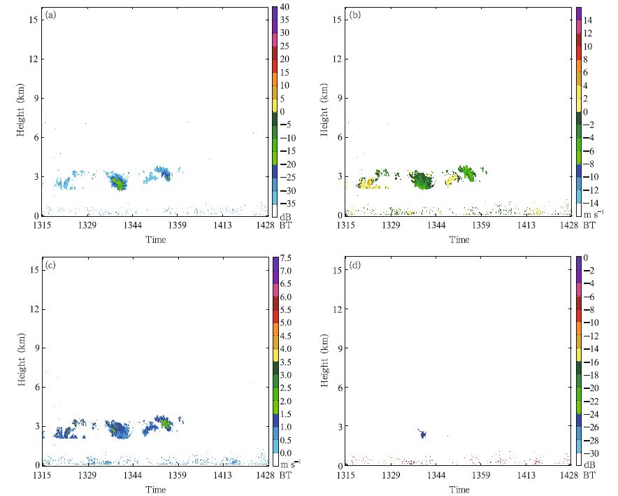 Figure 6 shows the time-height cross-sections of reflectivity, radial velocity (positive upward), velocity spectrum width, and depolarization factor LDR for the newly formed cumulus clouds. The vertical y-axis indicates height, the x-axis indicates time, and the origin indicates the radar antenna (4560 m AGL, the same hereafter). It shows that cumulus cloud height is about 3 km, and the cloud depth is 2 km. These cumulus clouds are the low-level clouds shown in Fig. 2. They passed the radar station in a very short time, indicating that the clouds have a small horizontal scale. Looking at the radial velocity, no precipitation formed in the two clouds with the maximum reflectivity of -30 dBZ, while the radar measured radial velocity are mostly upward with a speed larger than 5 m s−1, indicating that the clouds are at their developing stage. Based on the statistical analysis of clouds in the TP,1400 BT corresponds to the time when cumulus clouds can develop rapidly. The cloud height and depth both grow quickly at this time. The radial velocity is negative in the other two clouds whose reflectivity reaches about -15 dBZ, suggesting that precipitate particles has formed in these clouds.