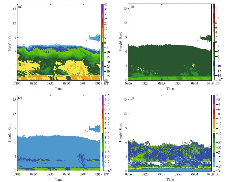 | Fig. 9 As in Fig. 6, but for the echo features of nimbostratus clouds observed by cloud radar during 0806-0919 BT 6 July 2014. |