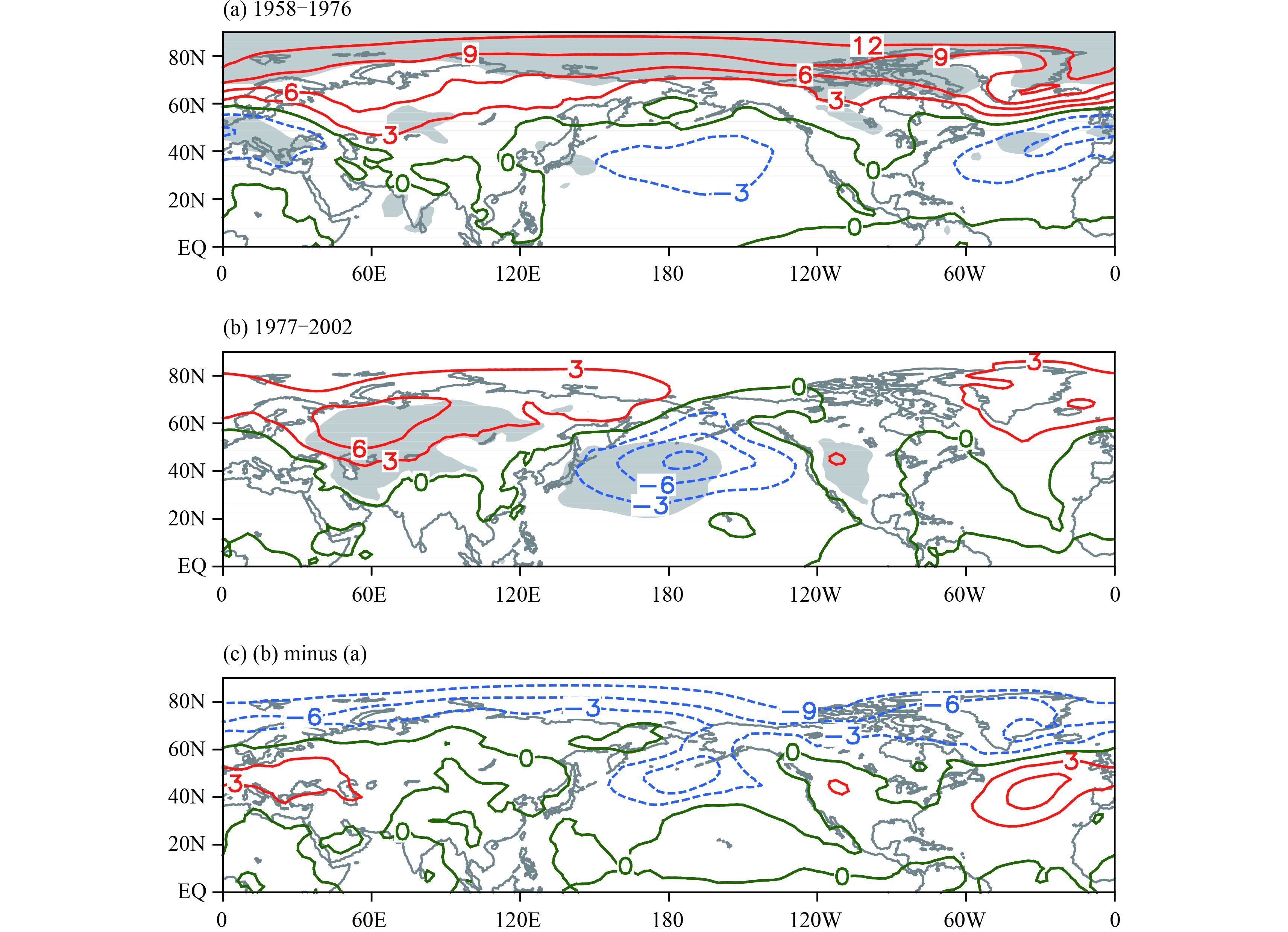 | Fig. 2 Composite mean differences of p's (contours; hPa) between years of strongly positive and negative ML during boreal winter for (a) 1958–1976 and (b) 1977–2002. The shaded areas indicate values that are statistically significant above the 95% confidence level according to the t-test. (c) Differences between the values of (b) and (a). |