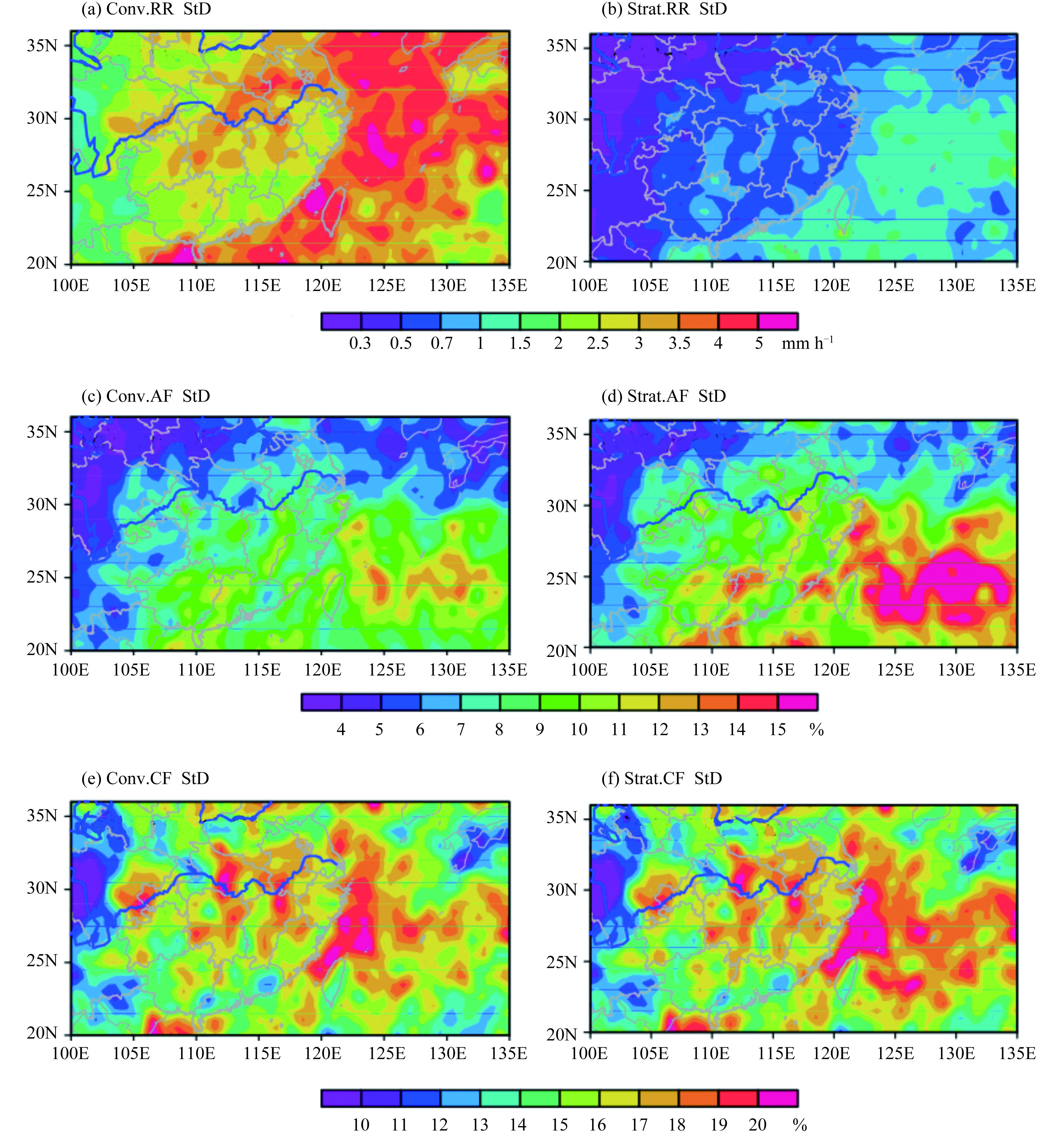 | Fig. 9 Standard deviations of (a, b) rain rate, (c, d) area fraction, and (e, f) contribution, of (a, c, e) convective precipitation and (b, d, f) stratiform precipitation, in summer, as observed by TRMM PR during 1998–2013. Redrawn based on Lu et al. (2016). |