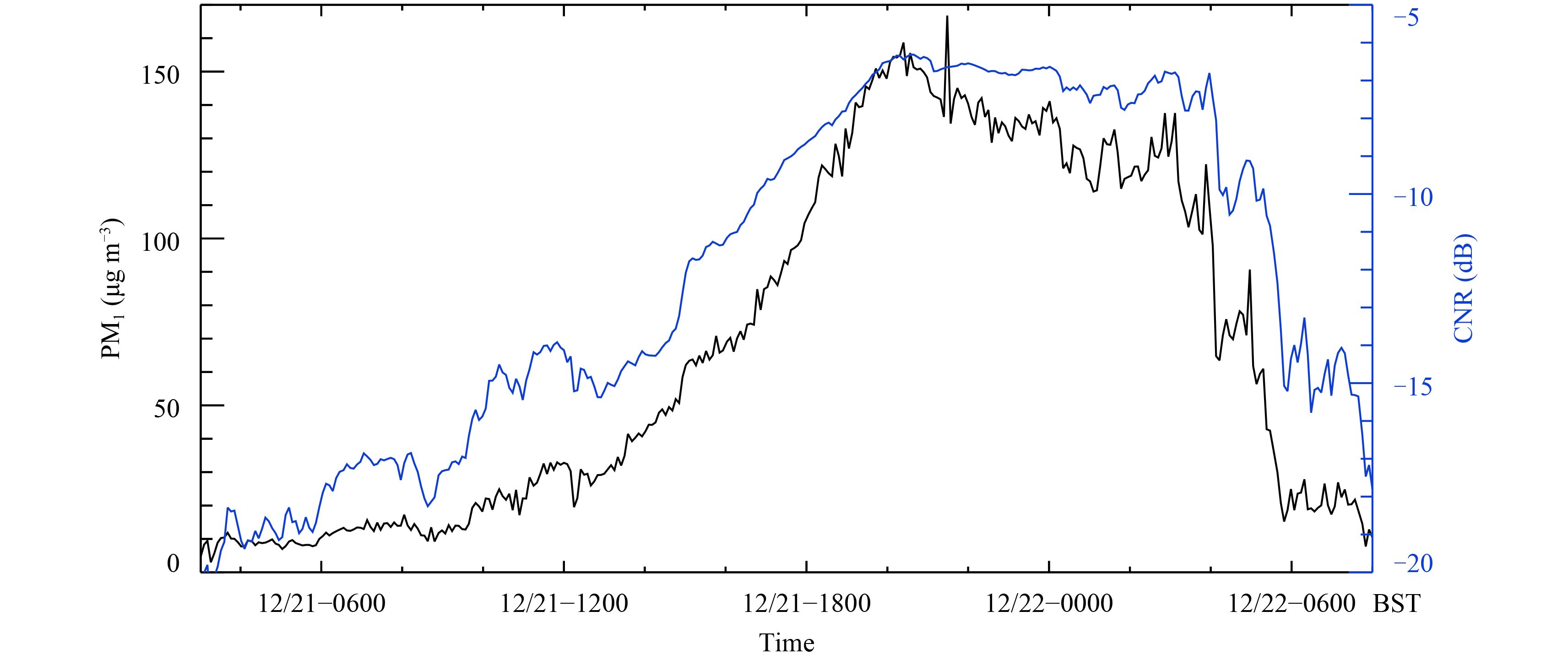 | Figure 12 Time series of in-situ PM1 measured by the ACSM (aerosol chemical speciation monitor) and the CNR (carrier-to-noise ratio) measured by the Windcube-8 (0300–0800 BST 21–22 December 2013). |