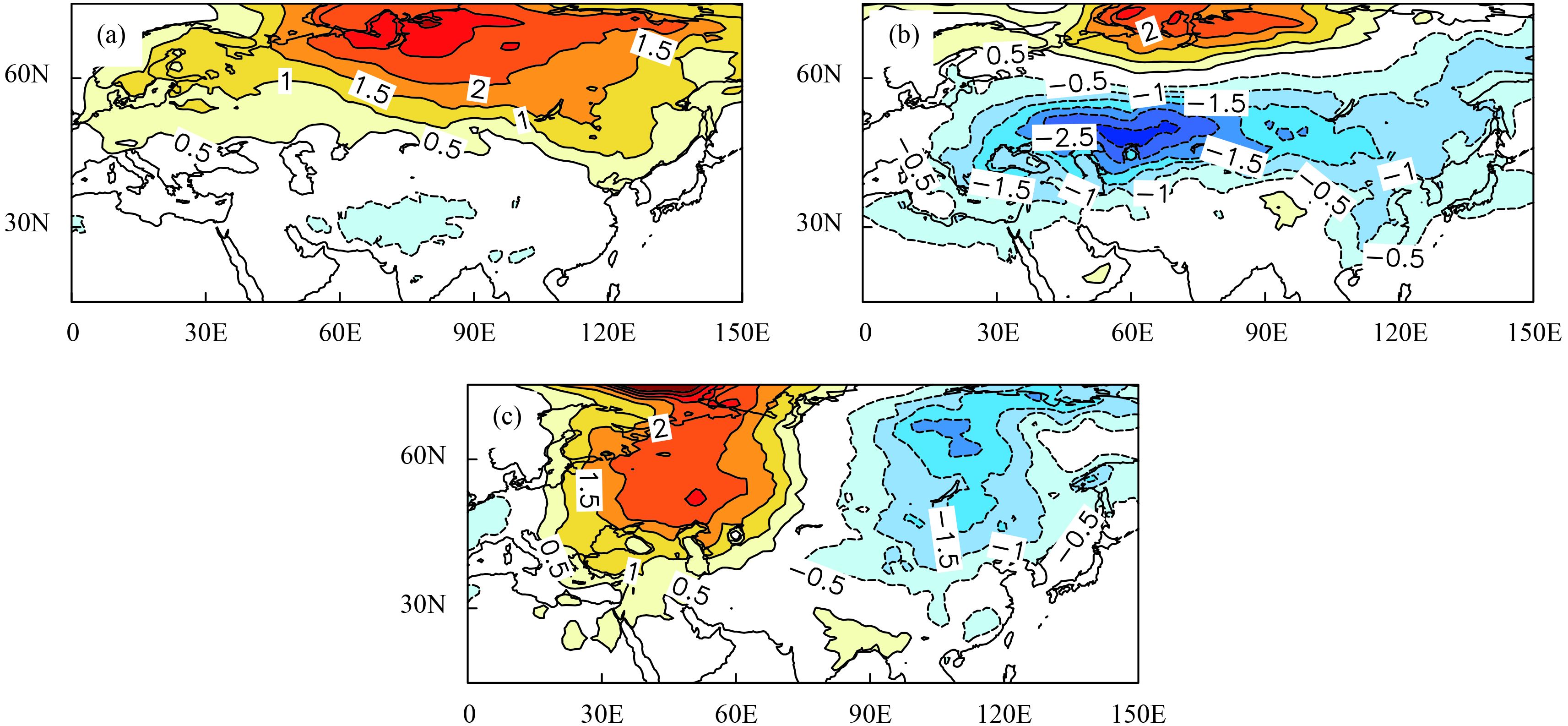 | Figure 2 (a) EOF1, (b) EOF2, and (c) EOF3 (multiplied by 100) (detrended) of 2-m temperature over Eurasia (15°–75°N, 0°–150°E) during March–April of 1980–2016. |