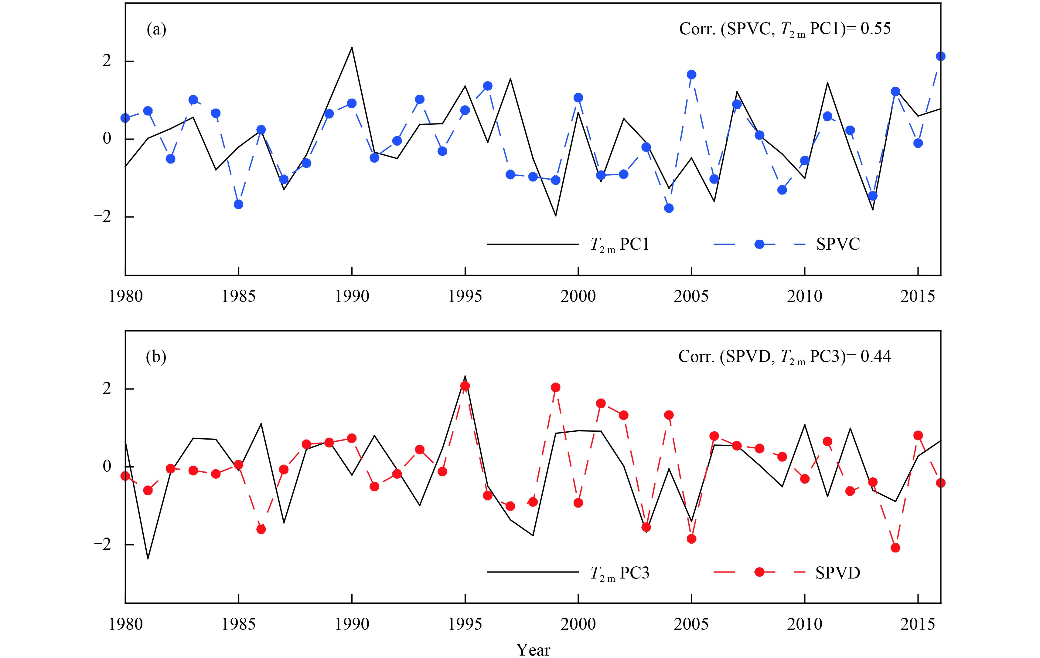 | Figure 4 Temporal evolutions of (a)T2m PC1 (black line) and SPVC (blue line) and (b)T2m PC3 (black line) and SPVD (red line). |