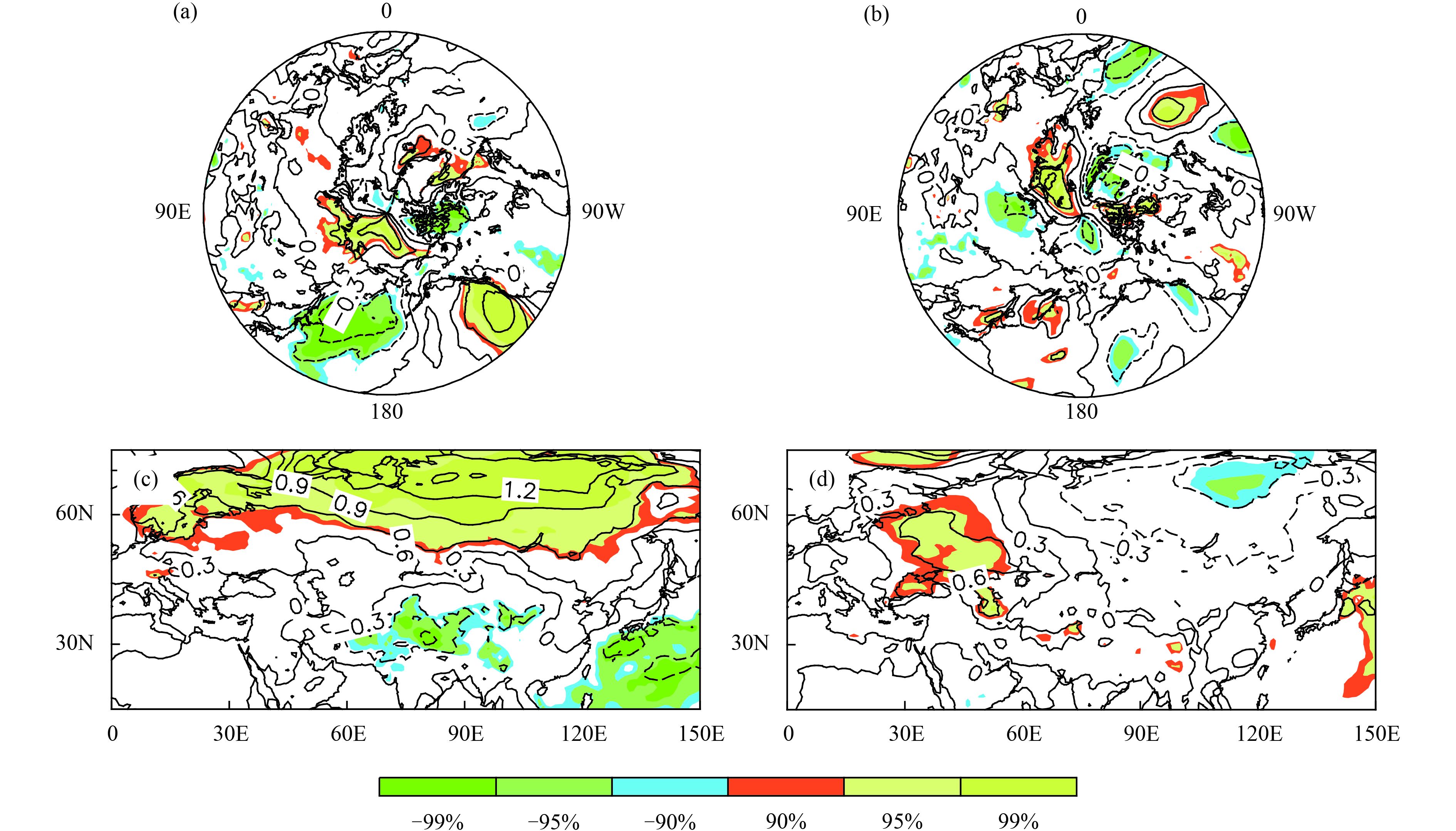 | Figure 7 Regressions of March–April (a) 1000-hPa meridional wind (m s–1) and (c) 2-m temperature (°C) anomalies upon the SPVC. Shading indicates significance at the 90%, 95%, and 99% confidence levels according to a two-tailed Student’s t test. (b, d) As in (a, c), but for the SPVD. |