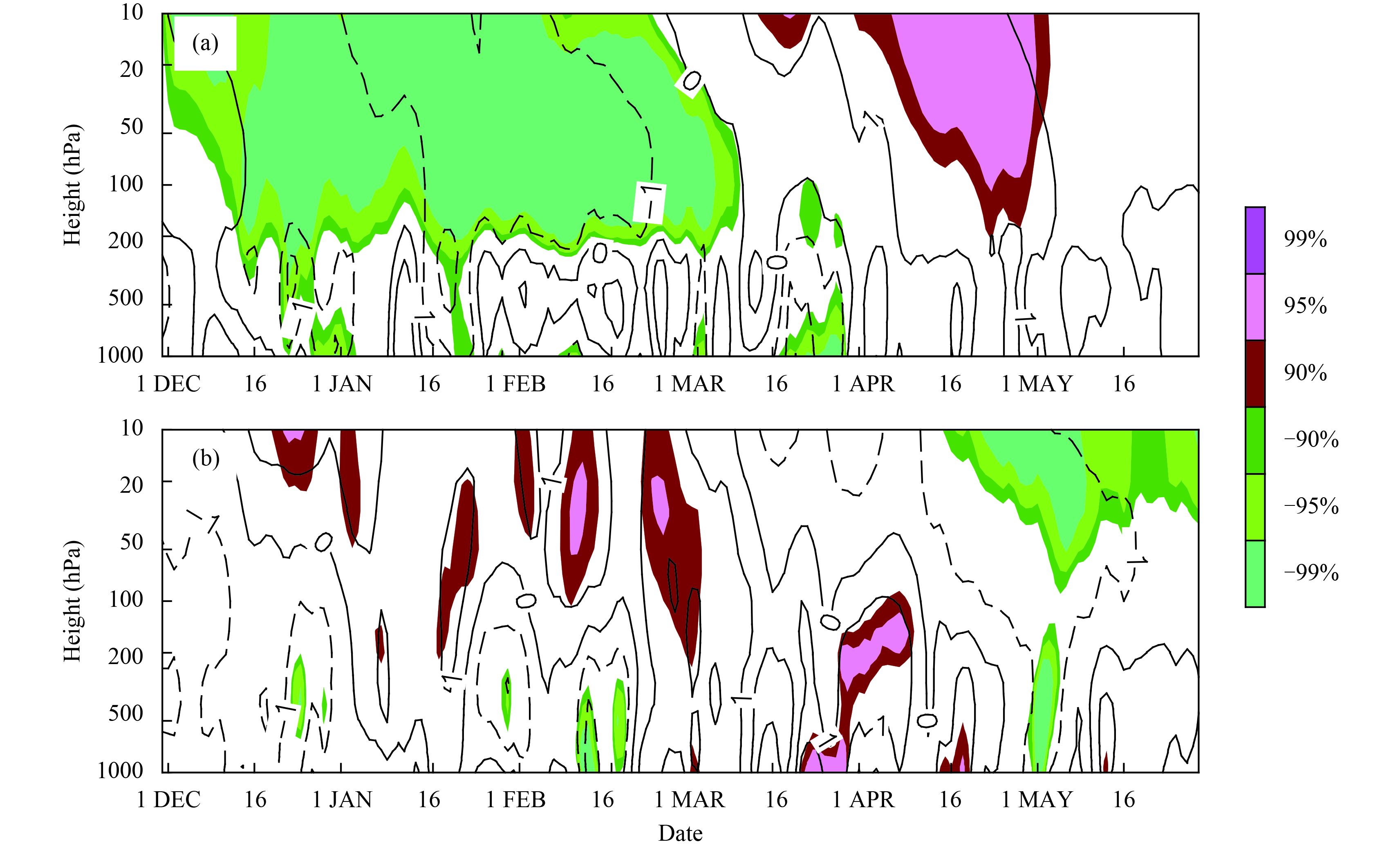 | Figure 8 (a) Composite differences in the sub-seasonal evolution of geopotential height anomalies averaged in the polar cap as a function of pressure between high (1983, 1993, 1996, 2000, 2005, 2014, and 2016) and low (1985, 1987, 1999, 2004, 2006, 2009, and 2013) SPVC years. Shading indicates significance at the 90%, 95%, and 99% confidence levels according to a two-tailed Student’s t test. (b) As in (a), but for high (1995, 1999, 2001, 2002, and 2004) and low (1986, 1997, 2003, 2005, and 2014) SPVD. |