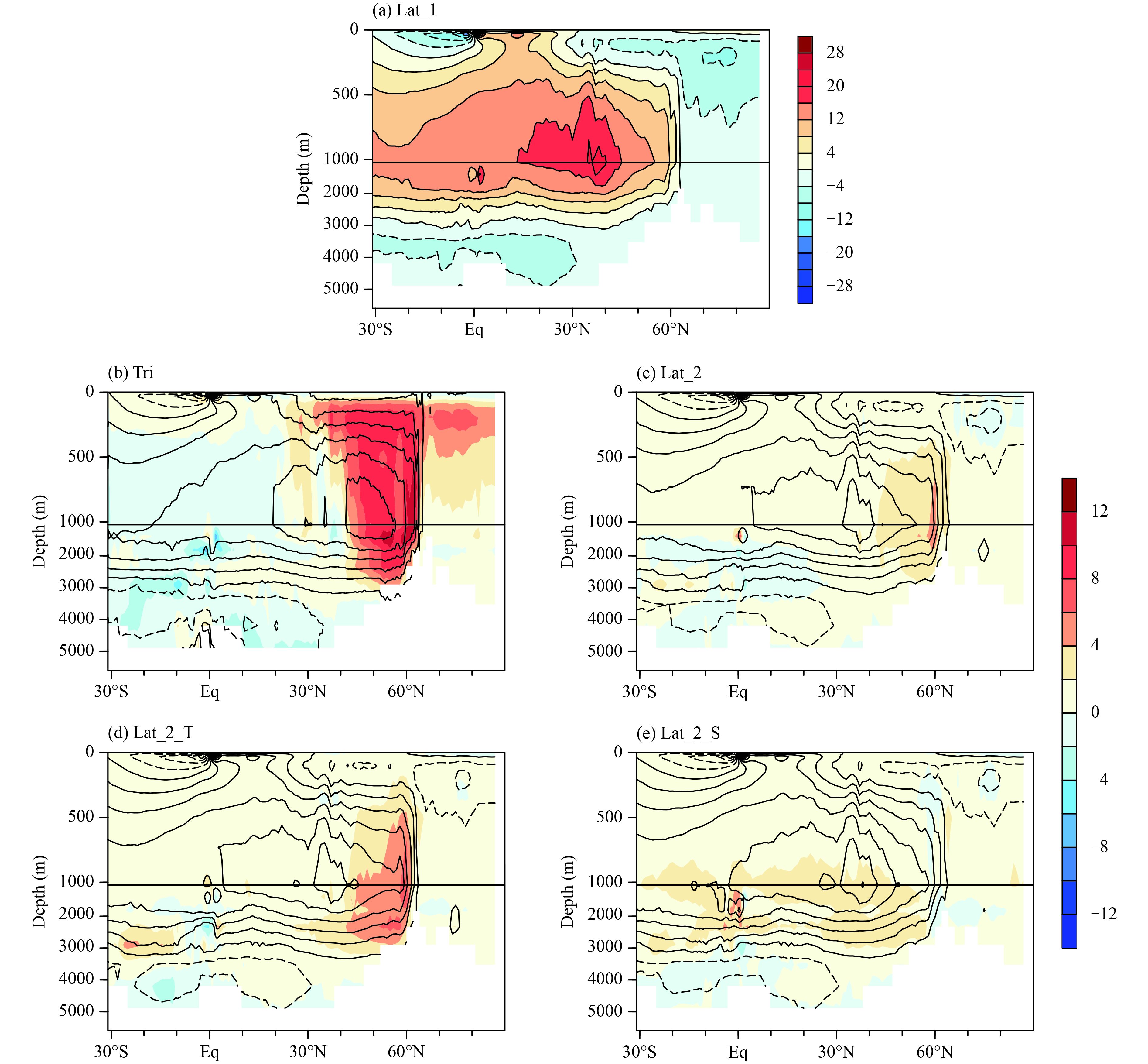 Figure 1 Annual mean AMOC (Sv; 1 Sv = 106 m3 s–1) from (a) Lat_1, (b) Tri, (c) Lat_2, (d) Lat_2_T, and (e) Lat_2_S (see Section 2.1 and Table 1 for details of these experiments). The contours in (b–e) indicate the simulated AMOC, and the color shading shows the differences between each experiment and Lat_1. The contour interval is 4 Sv. |