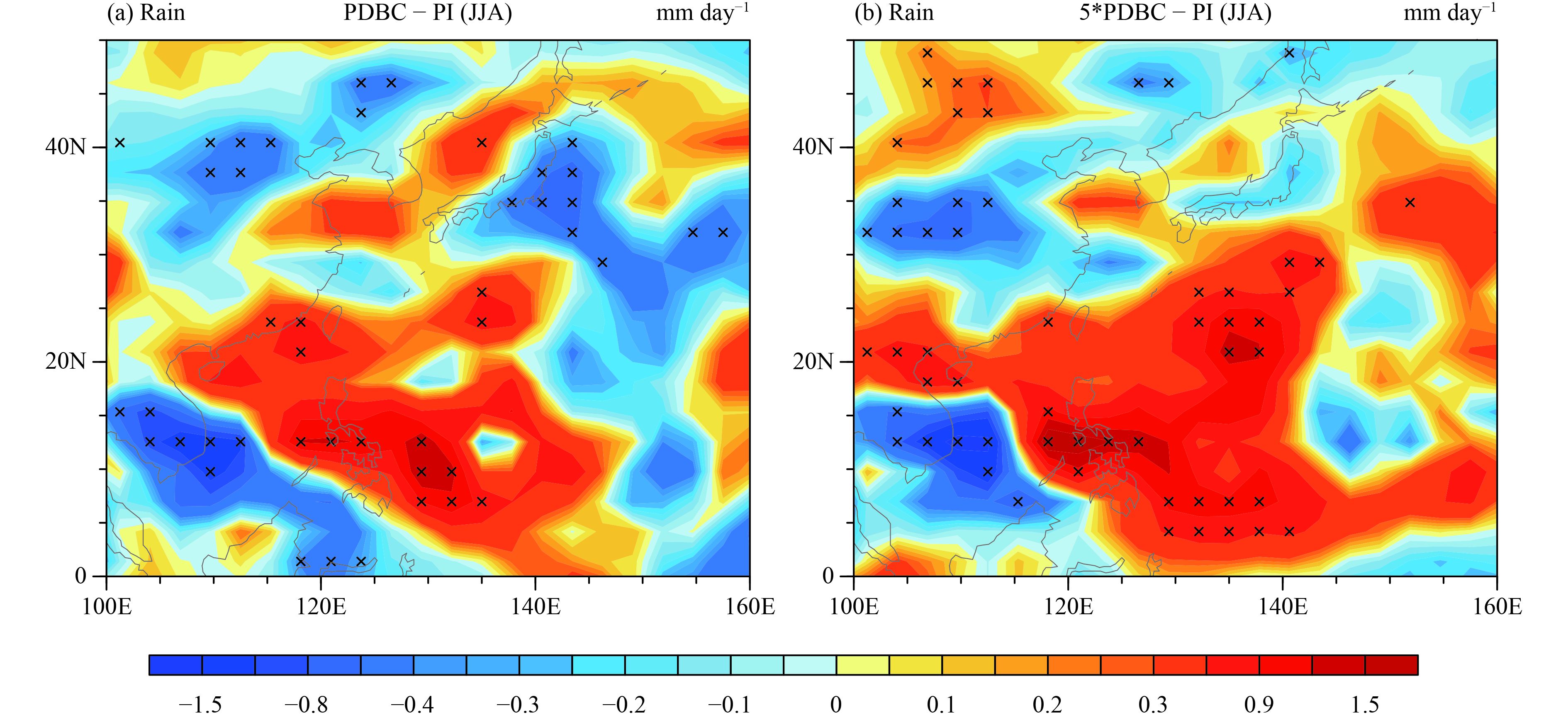 | Figure 12 Changes in (a, b) total rainfall (mm day–1) in summer due to the increase in (a) BC and (b) 5 × BC aerosol emissions from 1850 to 2000. The crosses are the grid points where the changes pass the t-test at the ≥ 95% confindence level. |