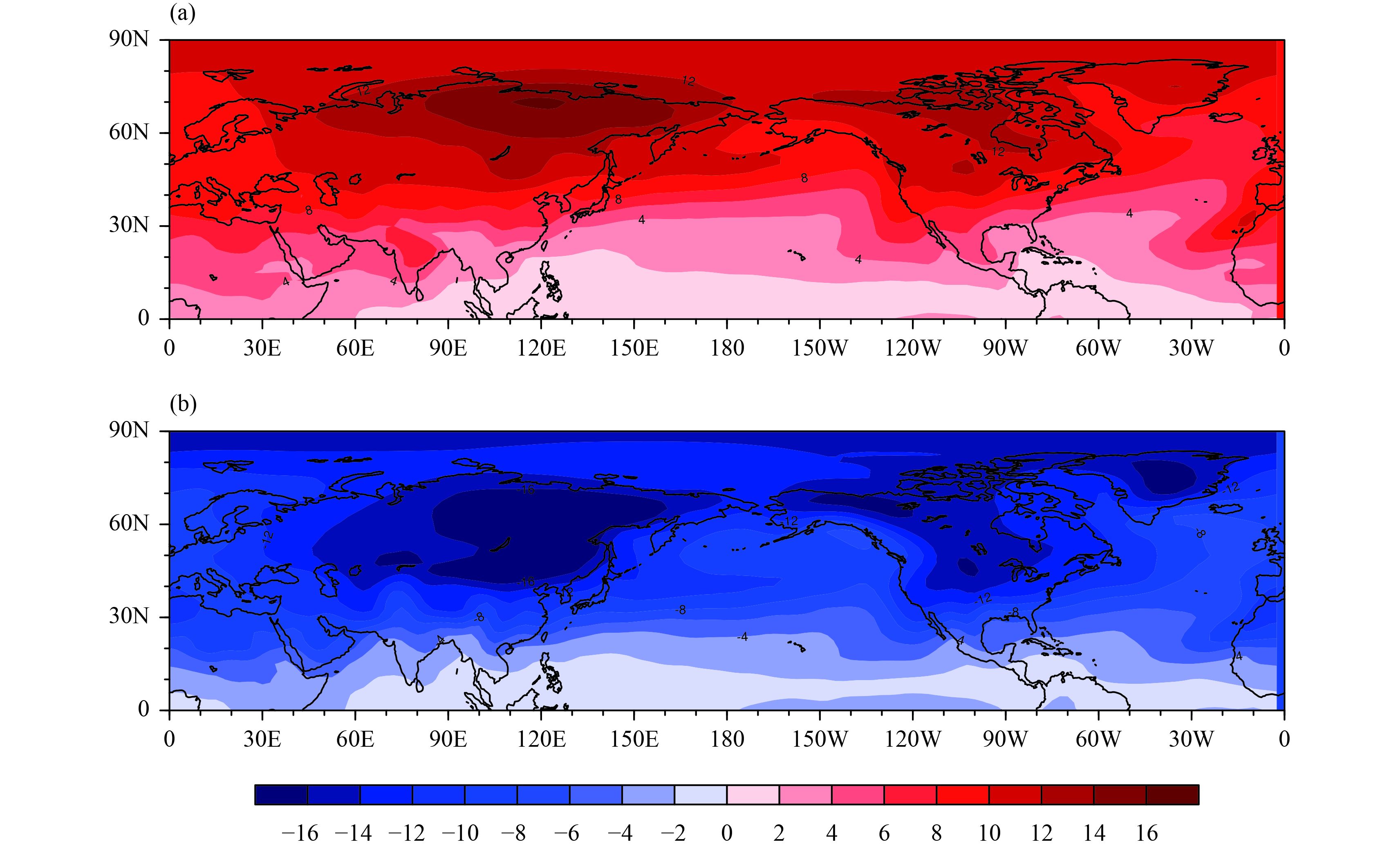 The definition above is done at each grid point so that the temperature thresholds differ spatially. Figure 3 shows the horizontal patterns for the extreme hot and cool temperature thresholds. Maximum and minimum values appear over high-latitude Asian and North American Continents along 60°N.