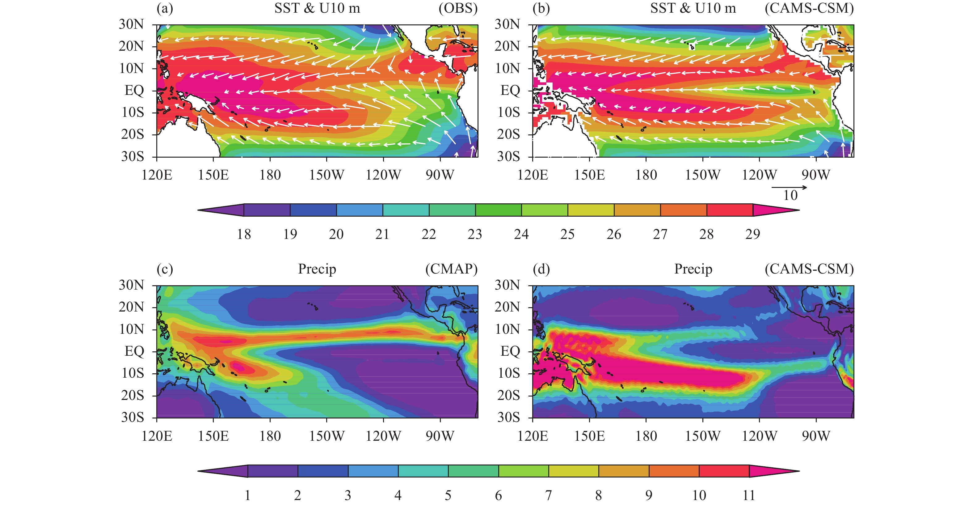 Figure 1 Climatological annual mean (a, b) SST (color shaded; °C) overlapped with surface wind (vectors; m s–1) and (c, d) precipitation (mm day–1) from (a, c) observation and (b, d) CAMS-CSM. |