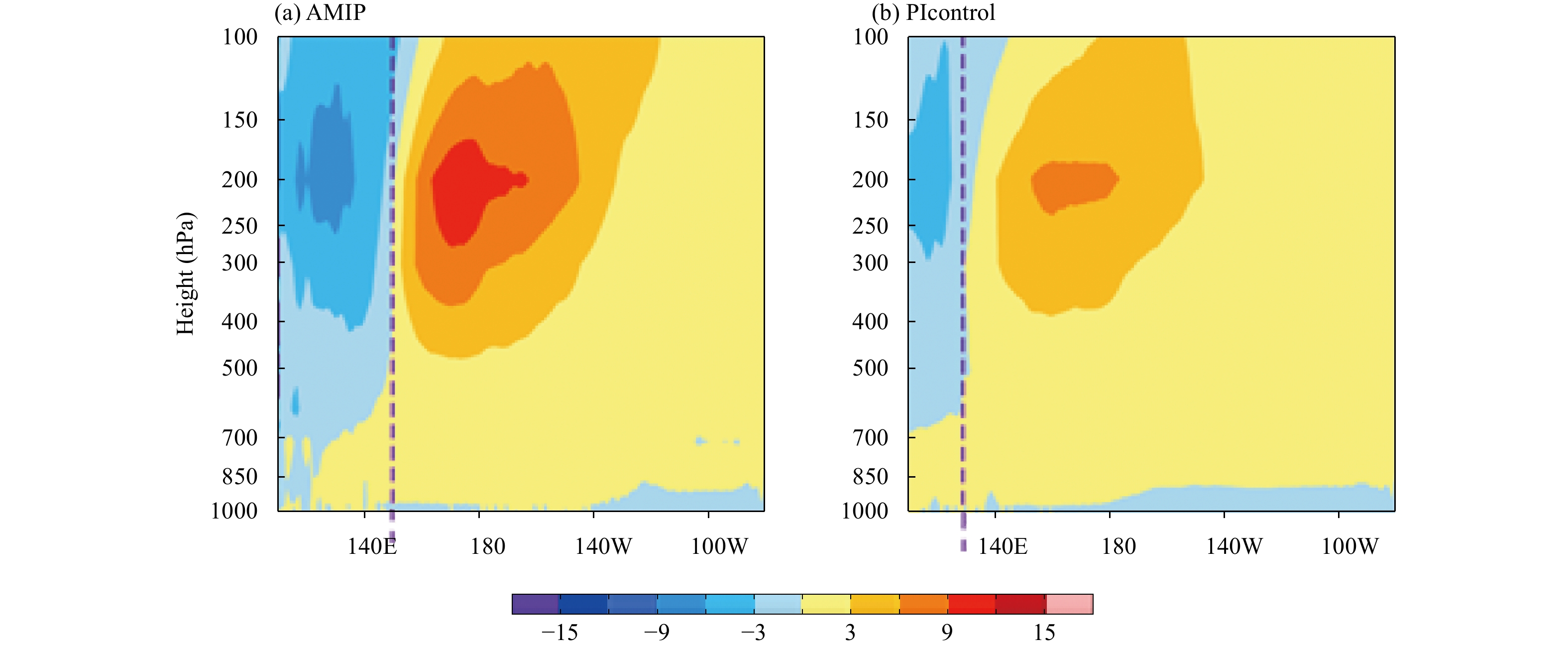 The simulation biases in representing both the CLD and PR feedback indicate that the main bias lies in the maximum centers of feedbacks. For example, the maxi-mum centers for response of precipitation and the corresponding CLD to SSTA changes during the ENSO cycle were represented correctly in the AMIP run, but the maximum centers of the CLD and PR feedback in the PIcontrol run show a westward shift, analogously. The westward shift bias also presented in response of the convection to SSTA changes during the ENSO cycle. As shown in Fig. 7, the atmospheric vertical velocity response to SSTA changes during the ENSO cycle exhibited the same westward shift bias in the PIcontrol run. Positions of the anomalous ascending motion in response to SSTA changes during the ENSO cycle in the AMIP run generally agreed with the observation, whereas anomalous ascending motion in the PIcontrol run exhibited a westward shift relative to the AMIP run and observation.