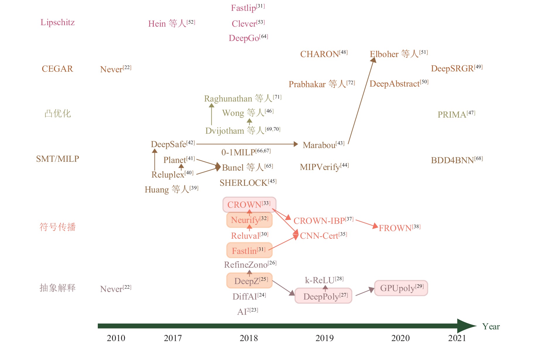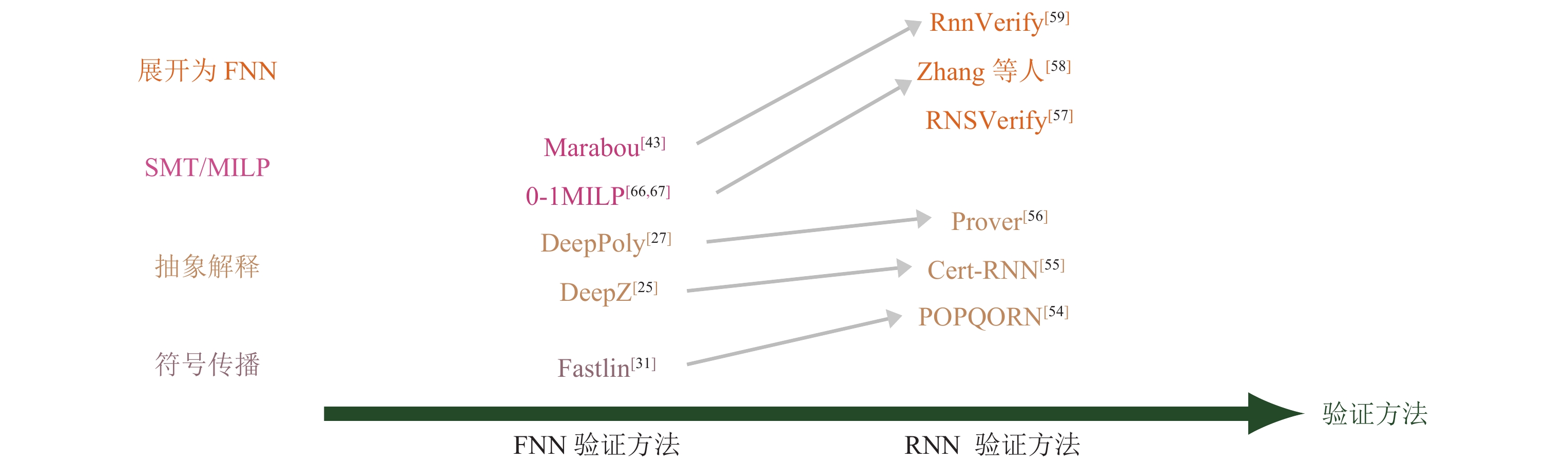 3 FNN验证的研究现状目前针对FNN的验证方法主要分为两大类: 一类是基于可满足性模理论, 混合整数线性规划等优化理论的精确验证方法; 另一类主要是基于凸优化, 抽象解释等近似验证方法. 在后文图 2中, 我们挑选出每一类中比较有代表性的验证方法进行对比[22-26,29-33,38-42,45-47,49-53,64-72]. 其中不同颜色表示不同的验证方法类别, 箭头表示被指向的工具对箭头出发的工具有提升或者是由其借鉴而来, 相同颜色的矩形方框中验证工具的精度相同. 接下来将详细介绍具体的验证方法.