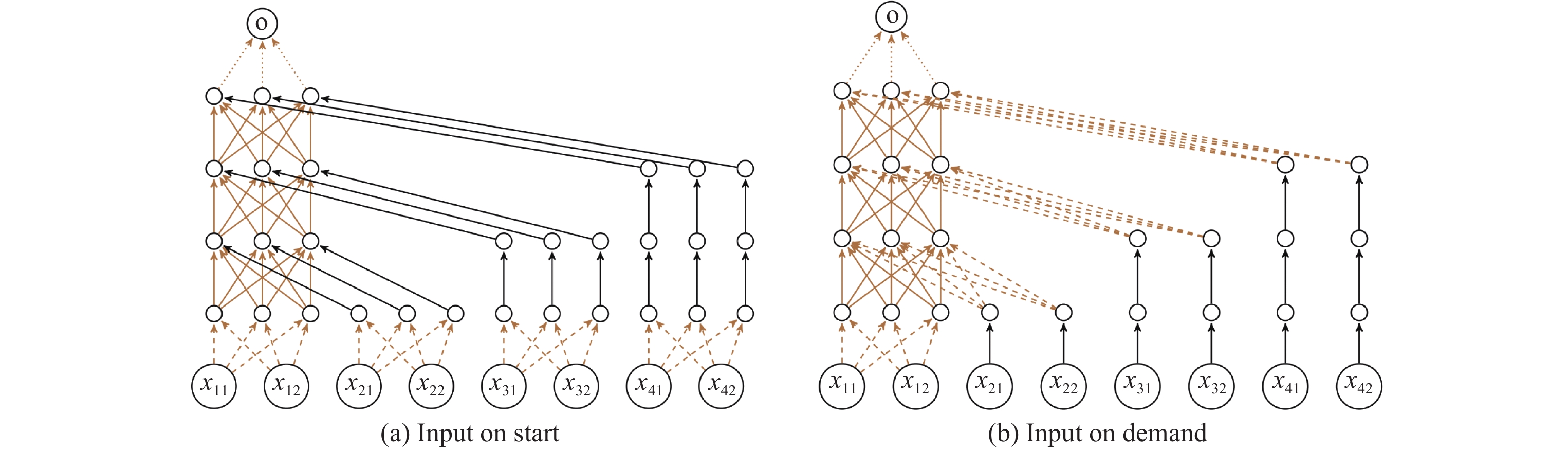 深度神经网络在结构上由顺序连接的若干层(layer) 组成, 其中起始层称为输入层(input layer), 接收神经网络的输入; 终止层称为输出层(output layer), 输出神经网络的运行结果, 其他中间的层称为隐藏层(hidden layer), 它们是神经网络运行的中间结果. 每一个层由若干神经元(neuron) 构成, 每一个神经元对应一个浮点数变量. 一般的FNN从输出层开始读取输入, 并按相邻两层定义的函数逐层顺序计算, 直到得到输出. 因此, 在数学上神经网络可以建模成一个多元函数
