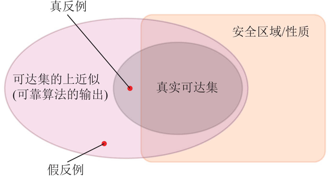 3.2.2 基于网络结构抽象/反例引导的抽象-精化的验证方法当验证算法对神经网络的抽象过于松弛时, 输出范围中可能含有许多不属于安全范围内的“反例”. 如果这些“反例”对应的原始输入经过神经网络传递之后得到的真实输出是属于安全范围的, 我们将这些“反例”称为“假反例”; 反之, 若这些“反例”的原始输入对应的输出也在安全范围之外, 则称为“真反例”, 其直观含义如图 3所示. 基于反例引导的抽象-精化方法(counterexample guided abstraction refinement, CEGAR) 通过抽象模型得到的假反例, 将过于松弛的抽象进行精化, 从而迭代地得到一个更精确的验证结果.