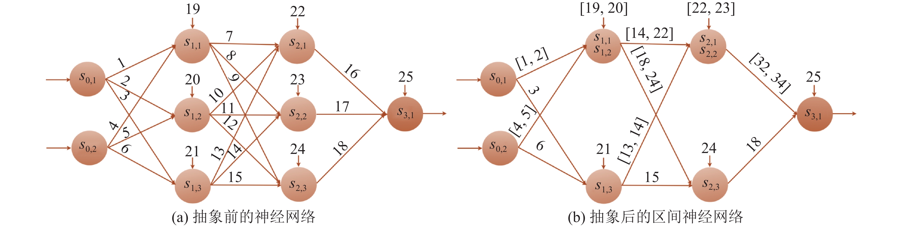 图 4 通过将普通FNN的权重矩阵元素抽象为区间表示可以减少神经元数量, 神经元上方的数字表示偏差 |