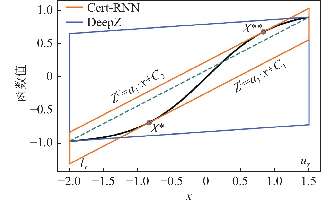 Singh等人提出的DeepZ框架[25]进一步解决了AI2的可拓展性问题, 适用于ReLU, Sigmoid, tanh等多种激活函数和前馈、卷积以及残差网络等多种神经网络结构. 类似于AI2, DeepZ也采用了Zonotope抽象域对神经网络的扰动区域进行松弛, 但DeepZ利用面积最小化原理为ReLU, Sigmoid, tanh等激活函数提供了一种更紧的可靠的抽象方式, 并利用Zonotope在神经网络中的传播求解最后一层神经元的范围, 从而验证网络的鲁棒性.