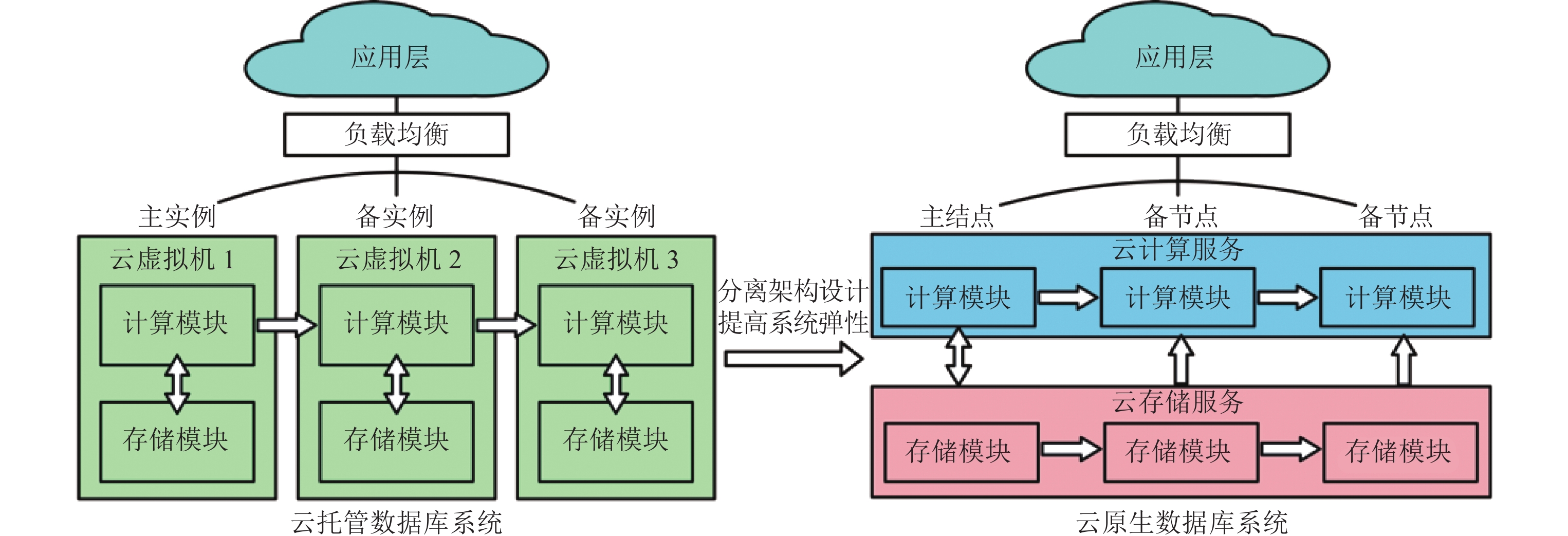 (3)优势与局限. 相较于云托管数据库, 计算-存储分离架构的云原生OLTP数据库具备如下3个优势: (i)降低数据写延时: 日志写入与记录页面同步更新分离(异步), 副本间的记录页面同步不会阻塞写入过程; (ii)减少写放大问题: 系统采用重做日志回放实现存储层记录页面的数据更新, 避免计算存储层间的脏页面传输从而减少网络开销; (iii)提高弹性调度能力: 计算和存储采用不同的云服务, 资源调度过程完全分离. 系统的主要限制在于: 计算层备节点缓存失效时读取延时较高, 需要通过存储层请求数据. 存储节点在重做日志未完成回放时, 无法直接从记录页面读取数据, 需要面临在线解析日志获取最新数据的额外延时.