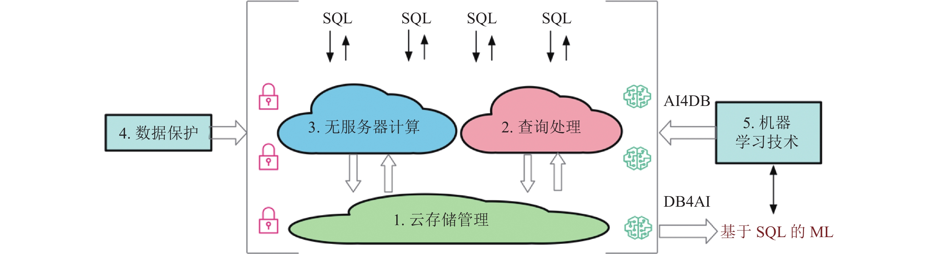 后文表4列出了每一个技术类别的关键技术以及它们的优缺点. 首先, 存储管理技术涉及元数据管理、关系数据划分以及半结构数据表示3个部分; 查询处理技术分为结合了下推计算、Shuffle内存层以及缓存的列式扫描的3类技术; 无服务器感知计算主要分为基于数据库实例的Serverless以及基于函数服务的Serverless; 数据保护分为基于密钥管理算法的数据保护与基于可信计算环境“飞地(Enclave)”的数据保护; 机器学习技术分为两个部分: 基于机器学习的云原生数据库技术和面向云原生数据库的自动机器学习.
