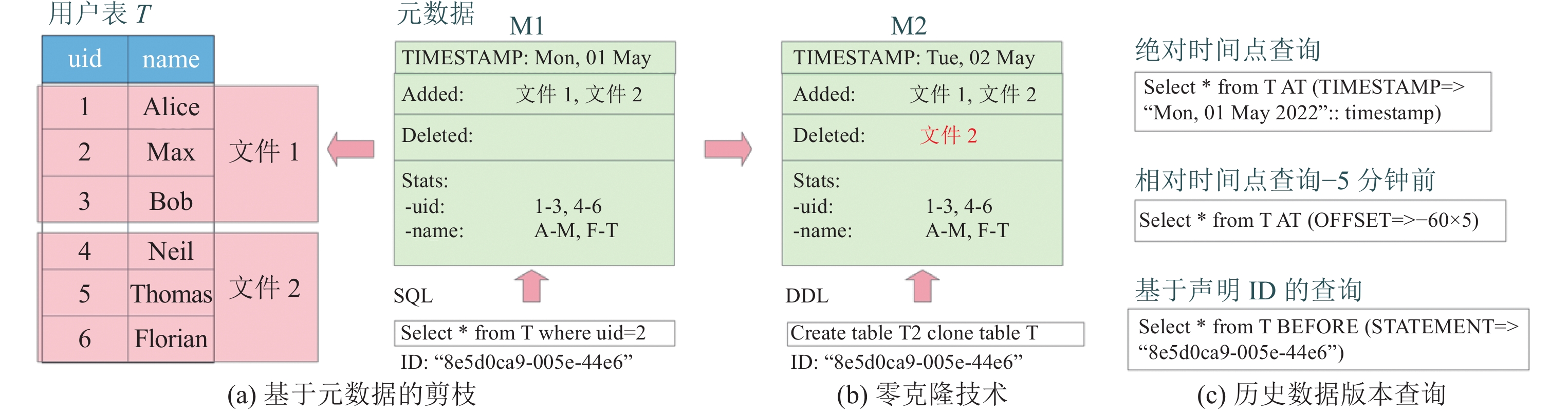 4.1.1 基于元数据的剪枝、拷贝与多版本并发控制(MVCC)元数据常被称为数据字典或“数据的数据”, 其主要存储数据的统计信息与版本信息. 针对云原生OLAP数据库, 此模块位于系统计算层的云服务管理器内, 可支持存储管理与查询优化, 其具体实现一般采用分布式的键值存储, 以保证高扩展性与高可用性, 如Snowflake采用了分布式的键值数据库实现其元数据存储. 下面介绍元数据管理的3项关键技术: (a)基于元数据的剪枝; (b)零克隆技术; (c)时间旅行操作; 如图11(a)所示, 对于用户表T, 元数据M1存储了其时间戳(timestamp), 对应分区的文件名(文件1和文件2), 以及各列的统计信息(值域的范围). 对于SQL查询“Select * from T where uid=2”, 云服务管理器可首先访问其元数据M1, 通过查找uid的值域的范围可将文件2进行剪枝, 只扫描文件1. 利用元数据还可以实现零克隆技术, 如图11(b)所示, 对于复制表T到T2的DDL操作“Create table T2 clone table T”, 云服务管理器并不直接复制表T的数据到T2, 而是通过新建一个元数据M2来记录源数据表的增量改变. 如图11(c)所示, 通过元数据记录的版本信息, 云服务还可支持通过MVCC机制进行历史数据版本查询, 即对不同版本的数据进行查询访问.