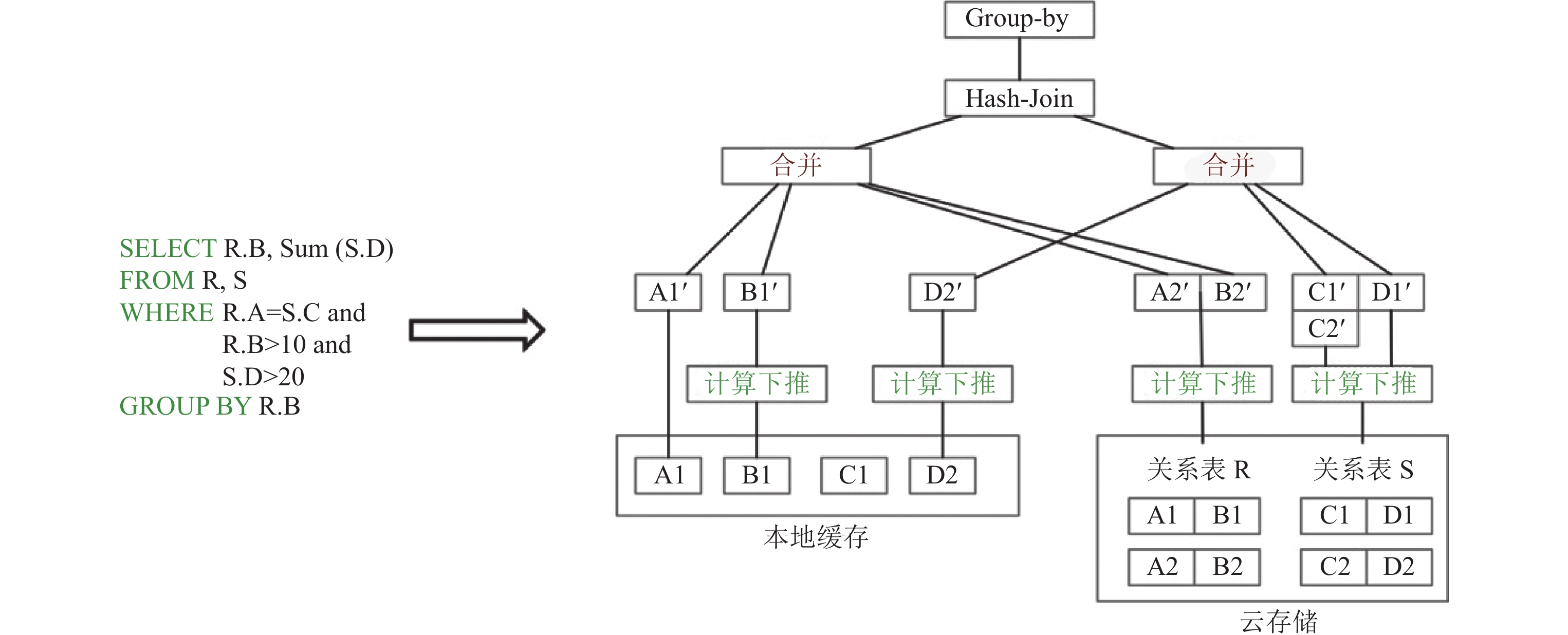 (2)查询执行流程. 基于这类云架构的查询处理分为以下3个步骤: (i)查询优化. 云服务管理器接受查询请求后, 查询优化器结合元数据存储的统计信息进行查询重写与优化, 并生成并行查询计划. (ii)基于缓存的查询处理. 查询子计划被发送到计算集群的各个计算节点, 如果缓存命中, 则直接将查询在本地处理后返回结果. 反之, 则向存储云请求数据. (iii)基于下推的查询处理. 存储云收到请求后, 则访问对应的列式文件, 并通过下推计算到存储文件, 最后返回过滤后的结果. (iv)结果合并与返回. 计算集群合并各个计算节点的中间结果(存在shuffle过程), 最后合并结果, 并由云服务管理器返回给用户.