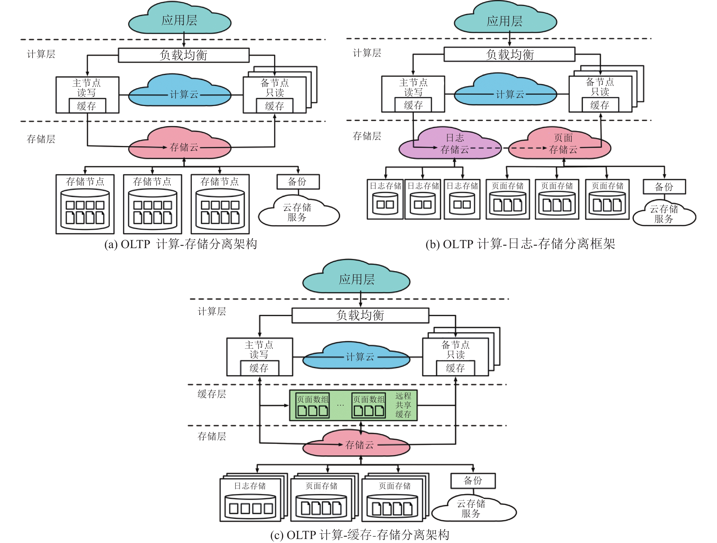 1.3 OLTP 计算-缓存-存储分离架构第3类云原生OLTP数据库系统采用了计算-缓存-存储分离的架构, 整体架构如图2(c)所示.
