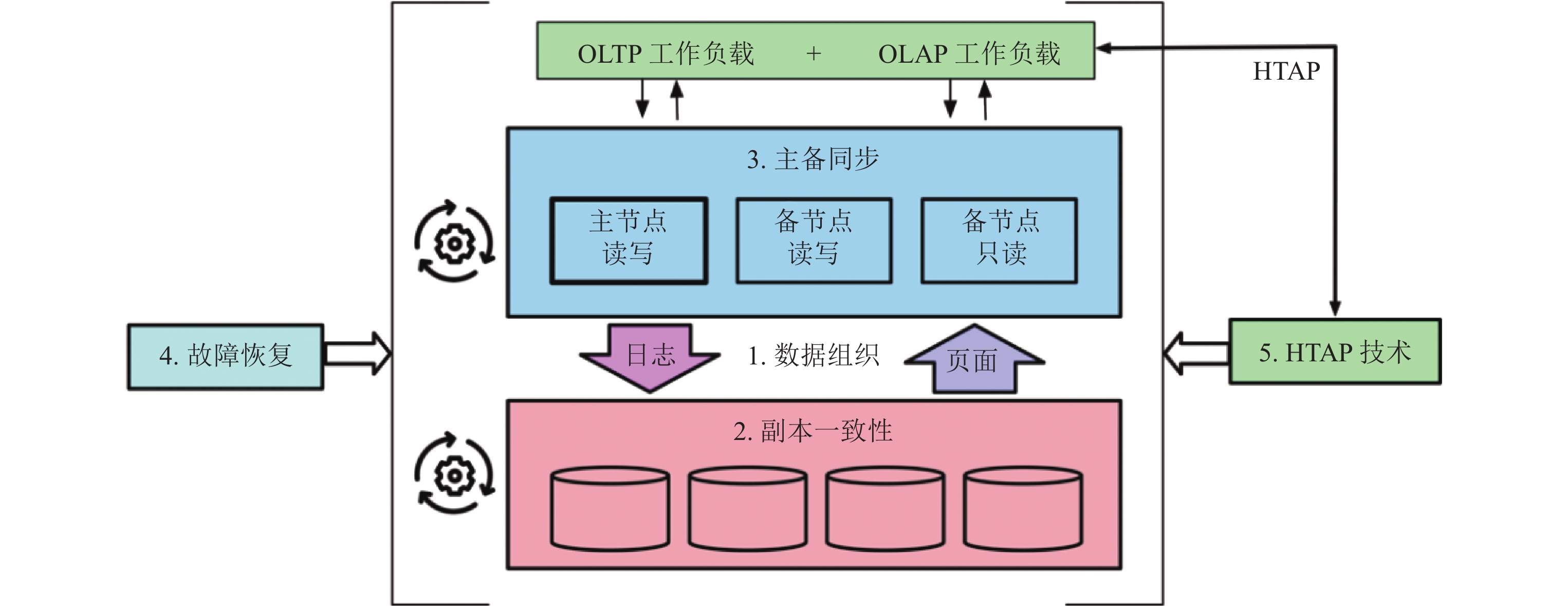 2 云原生OLTP数据库关键技术总体来说, 云原生OLTP数据库的关键技术, 包括数据组织技术、存储层副本一致性技术、主备更新同步技术、故障恢复技术、HTAP技术5个部分, 如图3所示. 表2列出了具体每一部分的关键技术, 并横向对比同类技术的主要优缺点. 其中, 数据组织技术是云原生数据库存储层管理不同类型数据(日志数据/页面数据)的技术(见第2.1节). 存储层副本一致性技术是云原生数据库存储层维护多个数据副本一致性的技术(见第2.2节). 主备更新同步技术是云原生数据库计算层主计算节点将事务更新同步到备节点的技术(见第2.3节). 故障恢复技术是云原生数据库应对不同类型异常而设计的多层次故障恢复的技术(见第2.4节). HTAP技术是云原生数据库在原有OLTP系统之上添加对于HTAP负载优化的技术(见第2.5节).