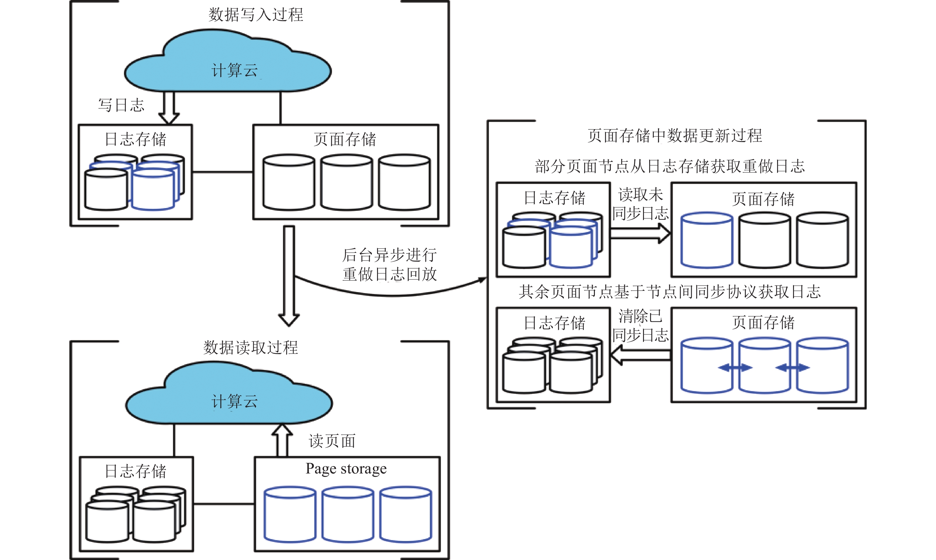 (2)数据读写路径. 数据写入路径方面, 主节点接收数据更新查询并生成对应的重做日志, 将重做日志写回到存储层中多数派的存储节点, 即视为写入操作完成. 然后异步完成备计算节点同步以及存储节点间的同步过程. 在这类架构下, 存储节点内同时存储重做日志以及记录页面, 并异步完成日志数据的回放. 数据读取路径方面, 计算层节点优先通过本地缓存获取数据, 当缓存失效时向存储层请求最新数据. 存储节点内部异步将日志回放到页面, 同时节点支持直接解析未完成回放的日志数据, 避免阻塞计算层的读取请求.