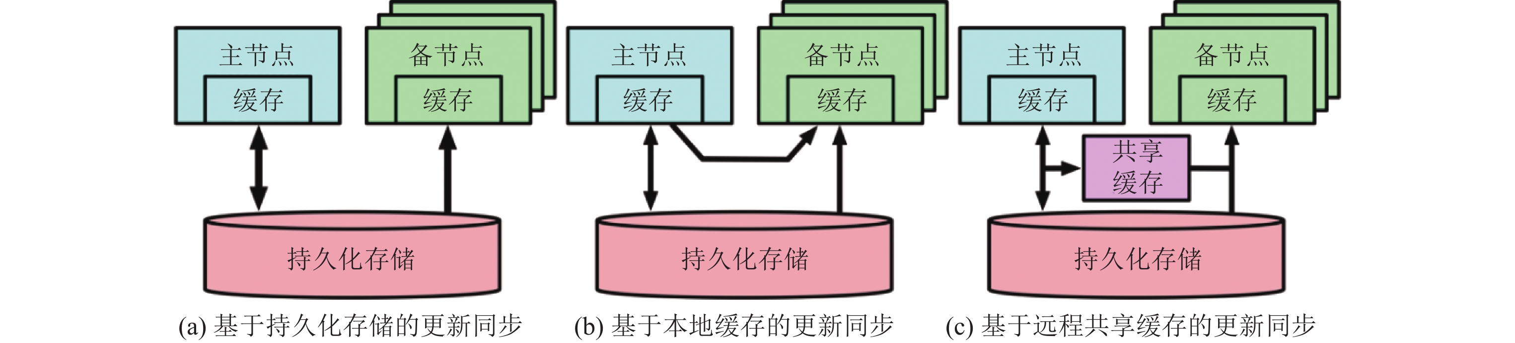 在云原生OLTP数据库中, 更新同步技术是指计算层主节点将事务的更新从主节点同步到只读备节点的技术. 这类技术要求系统在保证数据一致性的前提下, 降低备节点的同步延时. 这类技术可以按照同步路径可以划分为3类: (1)基于持久化存储同步; (2)基于计算节点本地缓存同步; (3)基于远程共享缓存同步. 第1类技术是最基本的同步方式, 在现有云数据库一写多读的架构下能够保证数据一致性. 但是主要的限制在于通过持久化存储读取数据需要经过网络I/O, 同步延时相对延时较高. 第2类技术则基于本地缓存进行更新同步, 主节点直接向备节点传输重做日志来更新本地数据. 这类技术的难点在于限制网络传输量以避免网络瓶颈. 第3类技术基于所有计算节点共享的远程缓存进行同步, 主节点将更新写入到共享存储后备节点可以直接从中读取. 这类技术的难点在于保证主节点与远程缓存的一致性, 避免备节点读取到已经变更的数据.