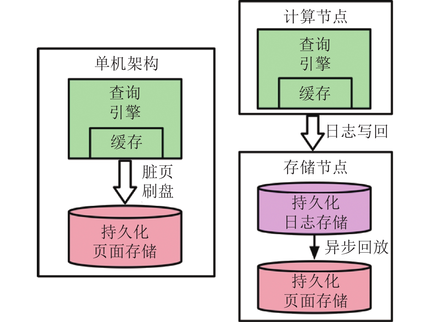 这类技术的主要挑战在于存储层内重做日志的回放. 日志存储到页面存储依赖于网络I/O, 同时需要考虑到页面存储部分节点的临时故障. 因此日志传输采用宽松的传输协议并结合页面节点间Gossip协议来避免日志回放过程阻塞系统运行. 总体上, 这类技术的优势在于: (1)利用高速云存储负责日志的写入, 降低整体数据写入延时; (2)存储层内无阻塞的日志回放过程, 加速数据更新的同步. 其主要的限制在于: 由于部分页面节点可能出现故障导致临时的数据缺失, 读取操作可能需要由多个存储节点完成, 一定程度上限制了数据读取的吞吐量.