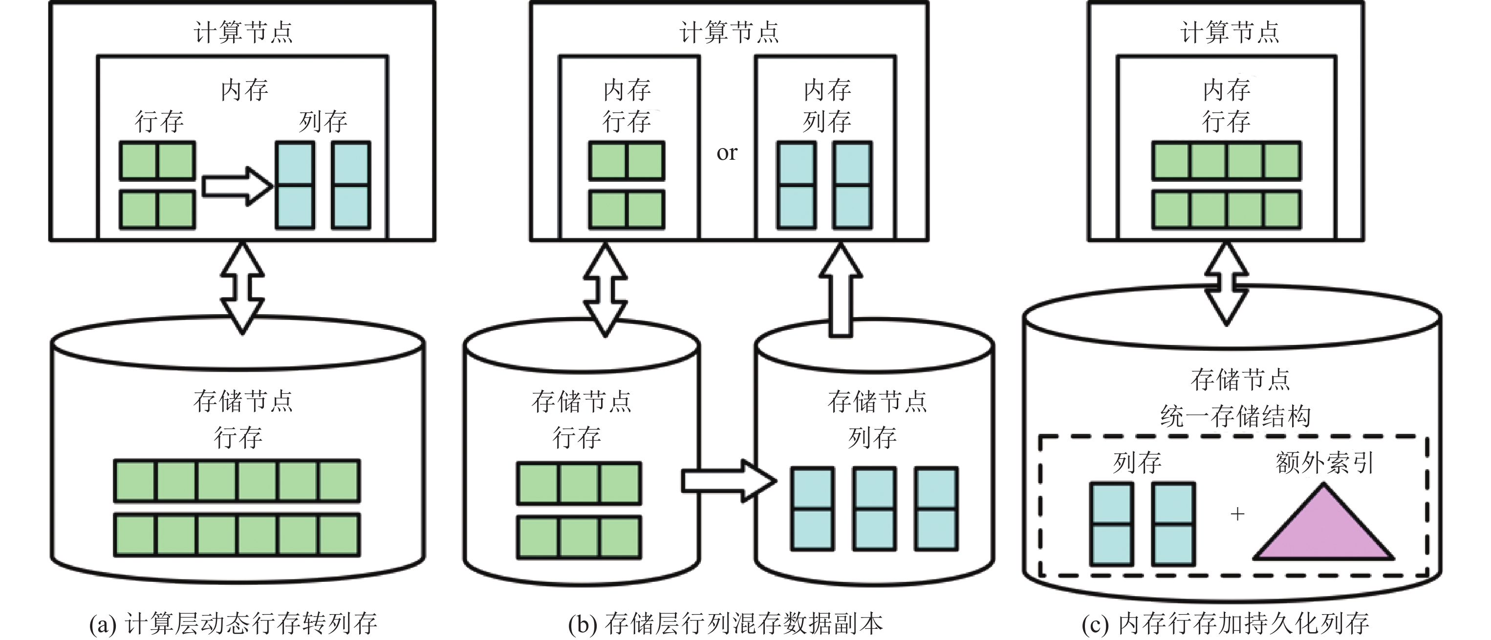 2.5 云原生OLTP数据库的HTAP技术云原生OLTP数据库的HTAP关键技术主要分为3大类: (1)计算层动态行存转列存; (2)存储层行列混存数据副本; (3)内存型行存加持久化列存. 图8展示了不同技术的示意图, 接下来将分别介绍这3类HTAP技术.