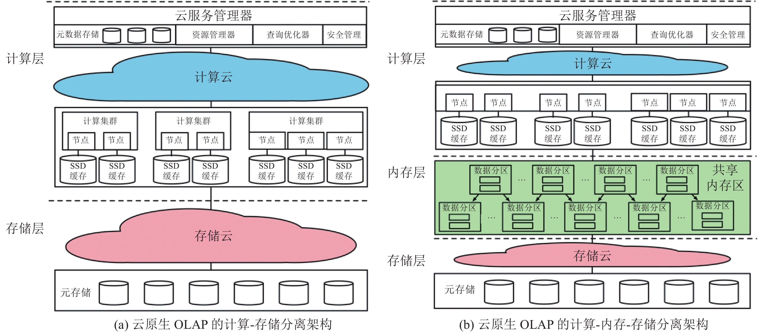 3.2 云原生OLAP计算-内存-存储分离的3层架构如图9(b)所示, 第2类云原生OLAP数据库系统采用了计算-内存-存储分离的3层架构. 计算层、内存层、存储层之间同样采用高速网络进行连接, 采用这类架构的主要代表系统为谷歌的BigQuery[10]. 与第1类架构类似, 这类架构的计算层包含了云服务管理器和计算云, 计算节点可使用本地的SSD存储作为缓存. 不同的是, 其计算集群采用一种统一调度的方式管理所有的工作节点. 另外, 其增加了一层分布式共享内存层, 用于处理复杂查询的数据洗牌(shuffle)操作, 避免中间结果写入磁盘造成I/O代价. 最底层的存储云同样提供高可用与弹性的数据存储服务.