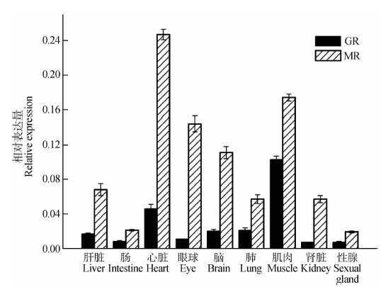 采用Real-time PCR检测到GR和MR mRNA在麻雀各组织中均有表达,其在心脏和肌肉中的相对表达量高于其他组织,肝脏、眼球、脑和肺次之,肠、肾脏和性腺较低。脑中的相对表达量与其他各组织相比,差异有统计学意义(P<0.05)(图 1)。