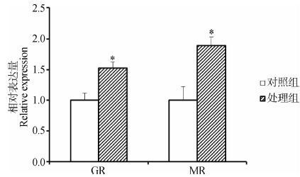 在饮水中加入500 μg·L-1 Cd2+ 15 d后,处理组麻雀脑组织中GR和MR mRNA的表达水平均上调,且显著高于对照组(P<0.05)(图 2)。