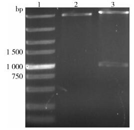 | 图 1 逆转录PCR扩增CZP3C基因的琼脂糖凝胶电泳分析 Fig. 1 Agarose gel electrophoresis analysis of CZP3C gene by reverse transcription PCR amplification 1. CZP3C基因,2. DL5000 DNA marker,3.阴性对照。 1. CZP3C gene, 2. DL5000 DNA marker, 3. Negative control. |